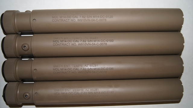 The Sound Suppressors were originally sent to the 2nd Infantry Division (2 ID) in Korea back in 2004. At that time the 2 ID ordered a total of 110 M14 Wind Talker Sound Suppressors along with 110 of Smith's M14 Crazy Horse upgrade kit which consisted of Smith Vortex Flash Hiders, mounts, rails, bipods, scope rings, gas lock front sites, upgraded heat treated barrels, extended bolt stop, and a long list of other parts. Right after the upgraded Crazy Horse rifles arrived in Korea, the 2 ID deployed to Iraq. Those suppressors stayed in Iraq transferring from unit to unit until the 2-505th PIR redeployed this past year. That is when Smith got the call from 1SG Onstine with the 2-505th.