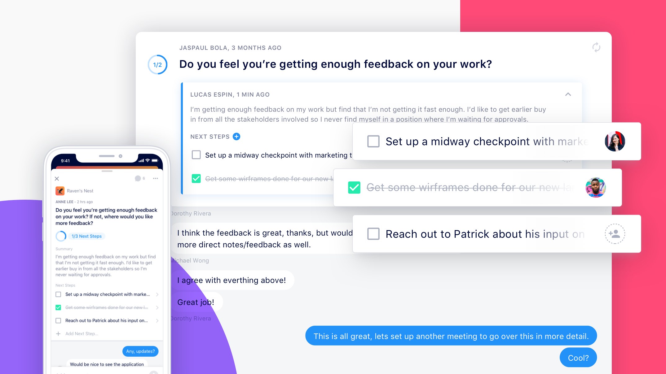 Next Steps: An action item tracker built into the meeting agenda, so nothing falls through the cracks. Accountability and ownership become easy habits to foster.
