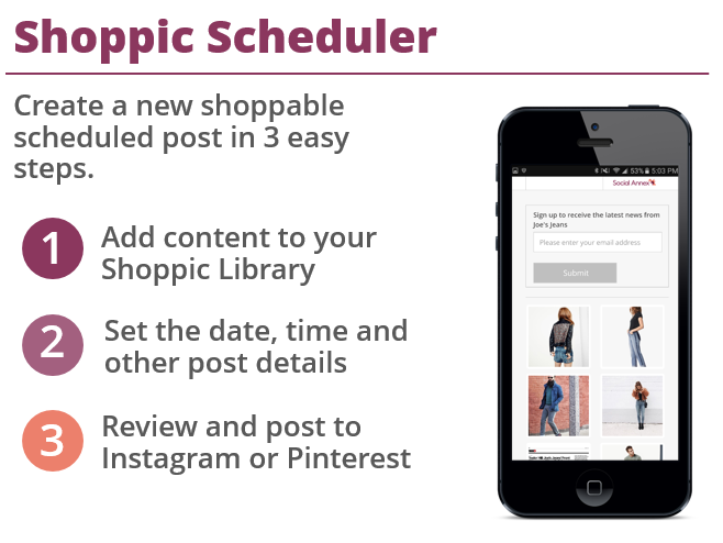 The Shoppic Scheduler links to a company’s Shoppic.me shoppable Instagram gallery to post content that directs users to their product pages. It works in three simple steps: