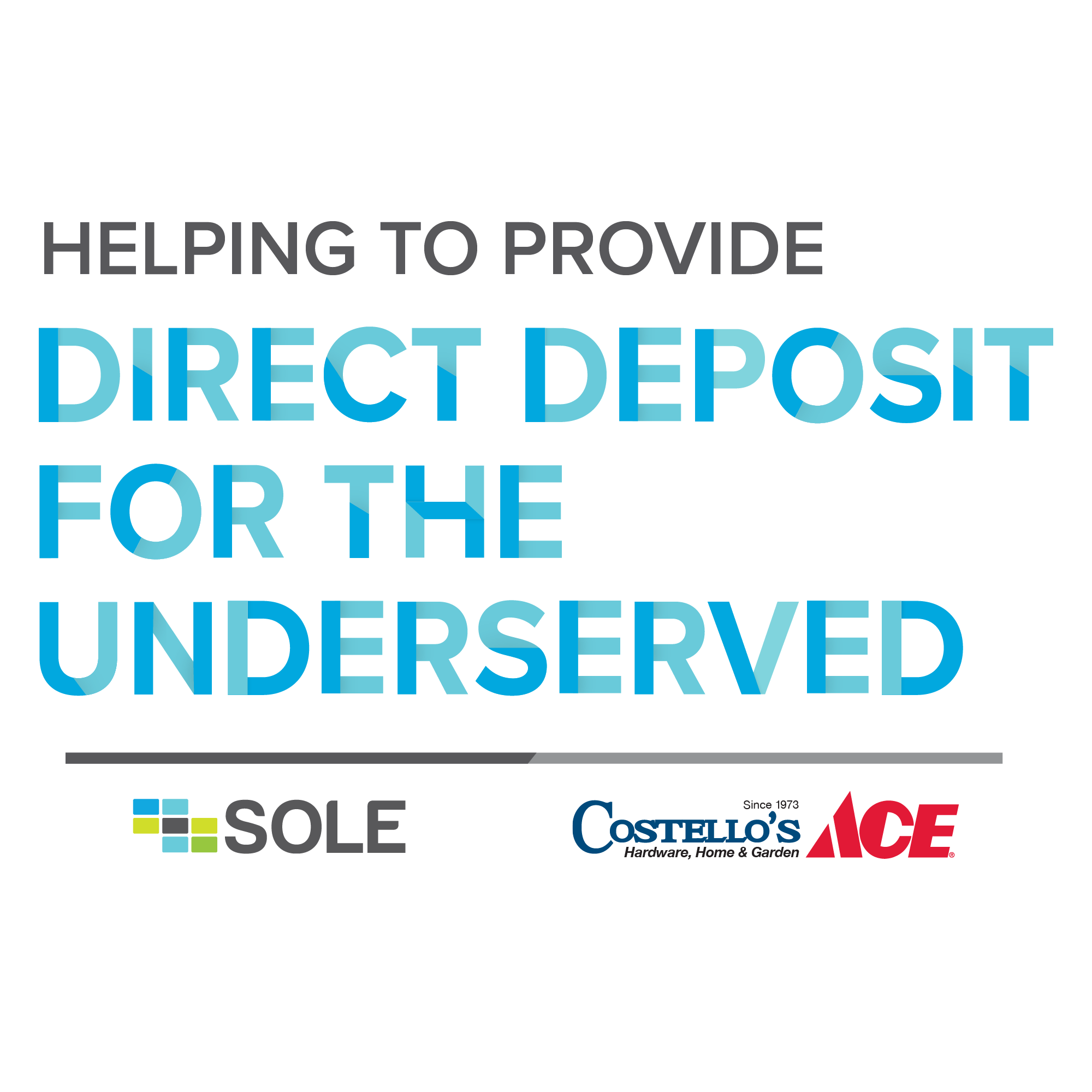 SOLE Financial President Tom Secor added, “We are thrilled to be giving Costello’s Ace’s unbanked employees access to direct deposit through the SOLE payroll card. By offering paycards to its employees, Costello’s is extending the reach of its admirable customer service and trust-building ethos inward, to its own workforce, by providing access to financial services and education through SOLE that many employees would not be able to obtain otherwise.”