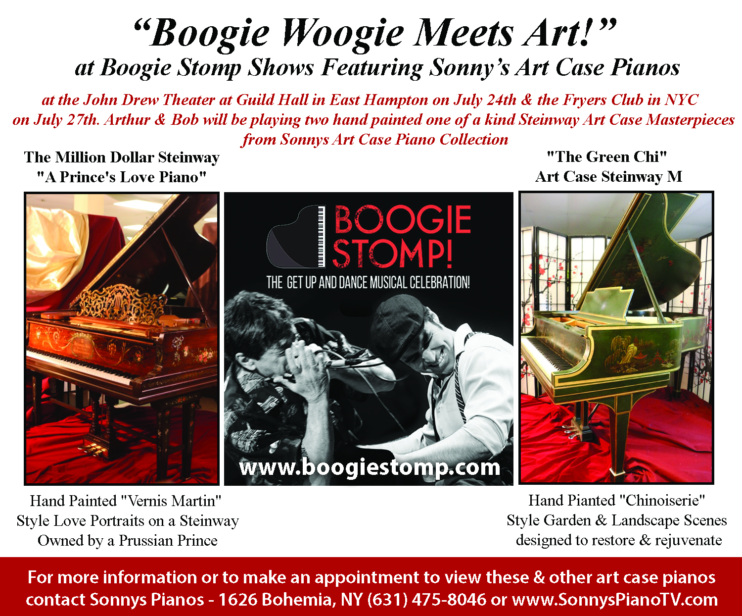 These artcase Steinways – the “Prince’s Love Piano” and the “Green Chi Piano” – will be used in Boogie Stomp, starring boogie kings Bob Baldori and Arthur Migliazza, a boogie, blues and jazz performance highlighting the history of American piano playing. These distinctly decorated pianos are completely restored instruments with state-of-the-art player systems installed. Each piano has a colorful history.