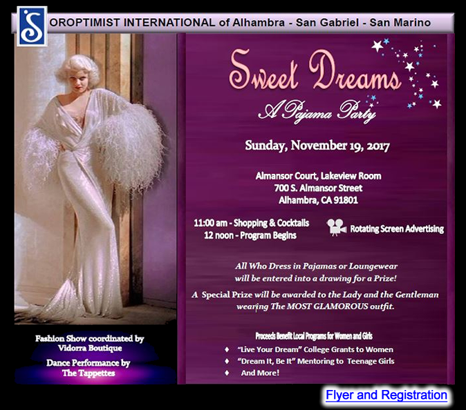 LOS ANGELES, November 7, 2017 (Newswire.com) - Soroptimist International of Alhambra, San Gabriel, and San Marino presents their annual charity event, Sweet Dreams Pajama Party and Fashion Show, on Sunday, Nov. 19, at Almansor Court, 700 S. Almansor St., Alhambra, California.