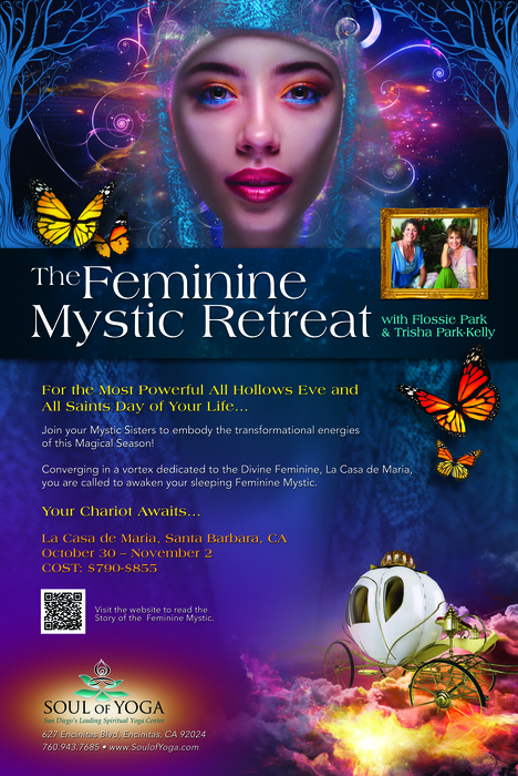The Story of The Feminine Mystic Retreat will be held October 30th-November 2nd at La Casa de Maria in beautiful Santa Barbara, CA. $790 without bus ride option or $855 for the group magical chariot bus option from La Costa Park and Ride. Those who pay in full by October 6th receive a 10% discount. http://soulofyoga.com/events/the-story-of-the-feminine-mystic/