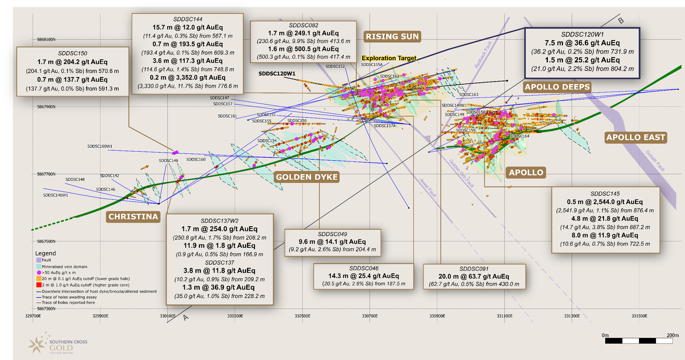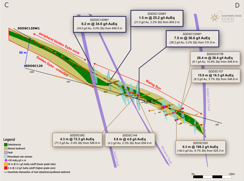 SDDSC120W1 was drilled east to west as a daughter navigational hole from the parent SDDSC120 ( 23 July, 2024 ) with the intention of targeting the northern strike extent of several vein sets within the western portion of the Rising Sun prospect. The drill hole successfully tested a prospective corridor of 347 m @ 1.2 g.t Au (uncut) (ie the cumulative downhole length of dyke/breccia/altered sediment between the "rails of the ladder") and intercepted six mineralized vein sets , two of which were previously unknown (the "rungs of the ladder"). The hole contained six intervals >20 g/t Au (up to 464.0 g/t Au) and five intervals of >2% Sb (up to 17.5% Sb) . The hole intersected three modelled vein sets, and defined three additional previously unmodelled vein sets one of which lies outside the exploration target area.