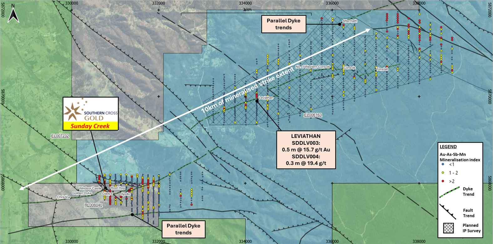 Southern Cross Gold Consolidated Ltd. (TSXV:SXGC, ASX:SX2) controls the Sunday Creek Gold-Antimony Project located 60 kilometres north of Melbourne, Australia. Sunday Creek has emerged as one of the Western world's most significant gold and antimony discoveries, with exceptional drilling results including 55 intersections exceeding 100 g/t AuEq x m from just 70.7 km of drilling. The mineralization follows a "Golden Ladder" structure over 12 km of strike length, with confirmed continuity from surface to 1,100 m depth.