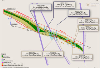 Southern Cross Gold's latest drill hole at Sunday Creek (SDDSC120W1) has delivered outstanding results, headlined by a 7.5 m intersection grading 36.2 g/t gold within a broader 347 m intersection within the mineralized host. The hole intersected six high-grade vein sets, including two previously unknown, with spectacular zones including 1.0 m @ 262.1 g/t AuEq and 0.3 m @ 122.1 g/t AuEq. Notably, the drilling successfully extended known mineralization up to 88 m down-dip on key structures.