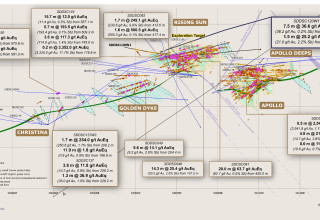 Our systematic drill program is strategically targeting these significant vein formations, initially these have been defined over 1,350 m strike of the host from Christina to Apollo prospects, of which approximately 620 m has been more intensively drill tested (Rising Sun to Apollo). At least 70 ‘rungs' have been defined to date, defined by high-grade intercepts (20 g/t to >7,330 g/t Au) along with lower grade edges. Ongoing step-out drilling is aiming to uncover the potential extent of this mineralized system (Figure 3).