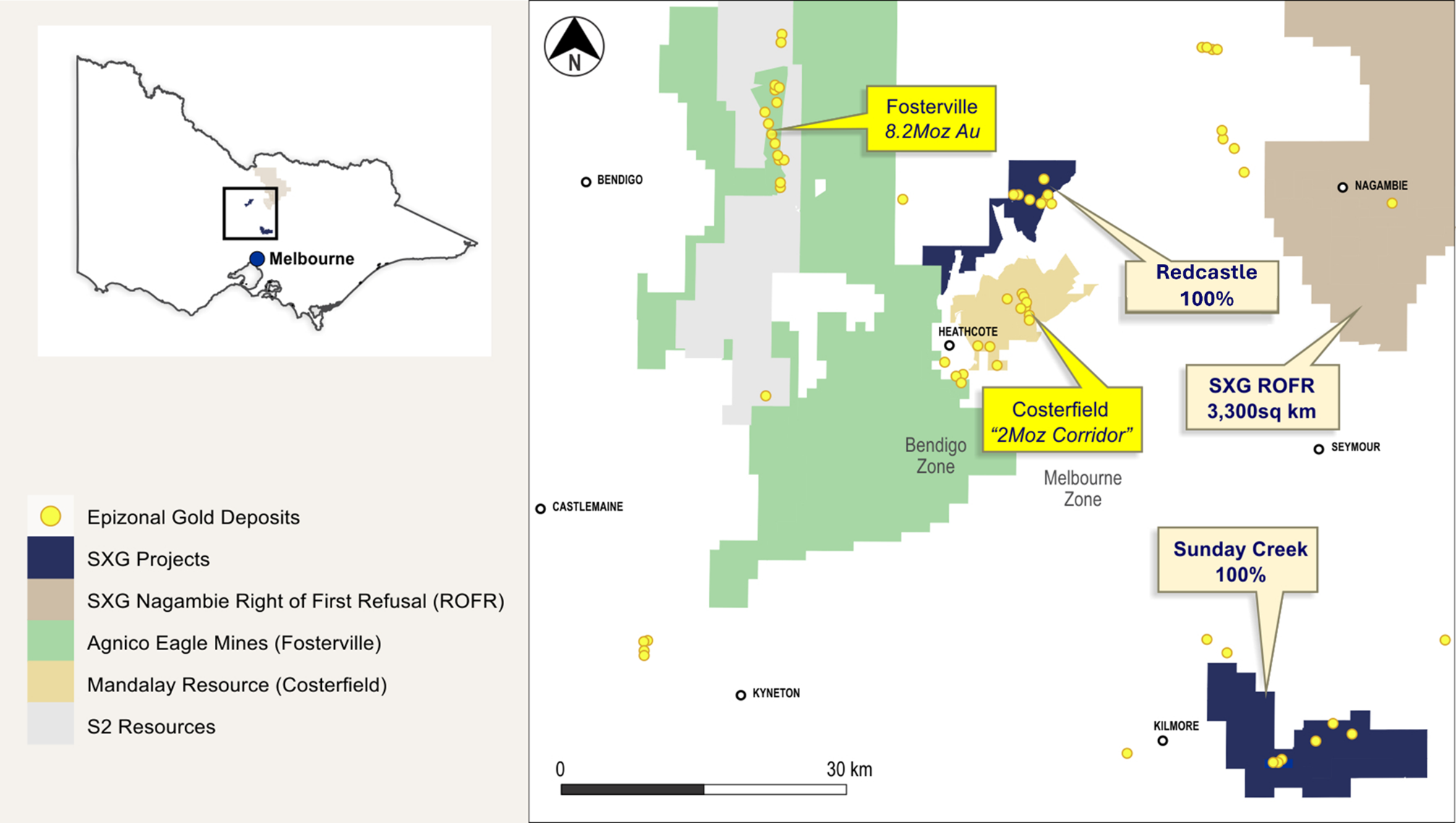 The Sunday Creek epizonal-style gold project (Figure 5) is located 60 km north of Melbourne within 16,900 hectares ("Ha") of granted exploration tenements. SXGC is also the freehold landholder of 1,054.51 Ha that forms the key portion in and around the main drilled area at the Sunday Creek Project.