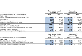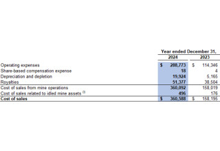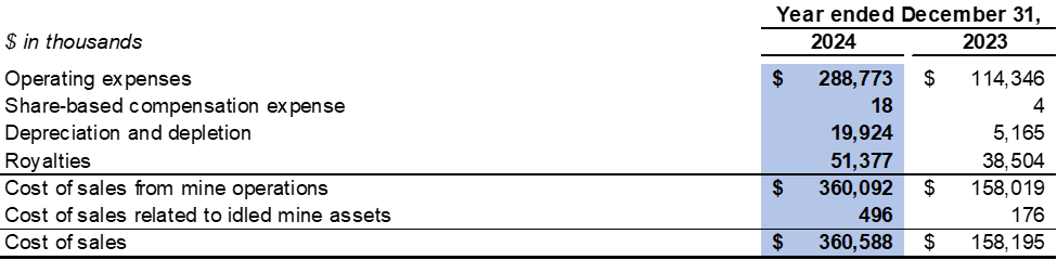 Cost of sales consists of operating expenses, share-based compensation expense, equipment depreciation, depletion of mineral properties, royalties and idled mine asset costs. Operating expenses in cost of sales reflect the total cash costs of product sold (a Non-IFRS financial measure, refer to "Non-IFRS Financial Measures" section of this press release for further analysis) during the year.