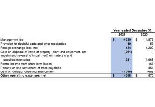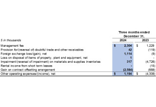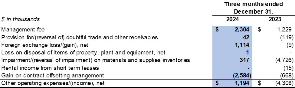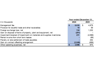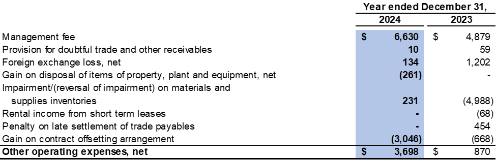 Other operating expenses were $1.2 million in the fourth quarter of 2024 (fourth quarter of 2023: other operating income of $4.3 million). A gain on a contract offsetting arrangement of $2.6 million was recorded and offset by management fee of $2.3 million and foreign exchange loss of $1.1 million in the fourth quarter of 2024 (fourth quarter of 2023: reversal of impairment on materials and supplies inventories of $4.7 million and gain on a contract offsetting arrangement of $0.7 million were recorded and offset by management fee of $1.2 million).