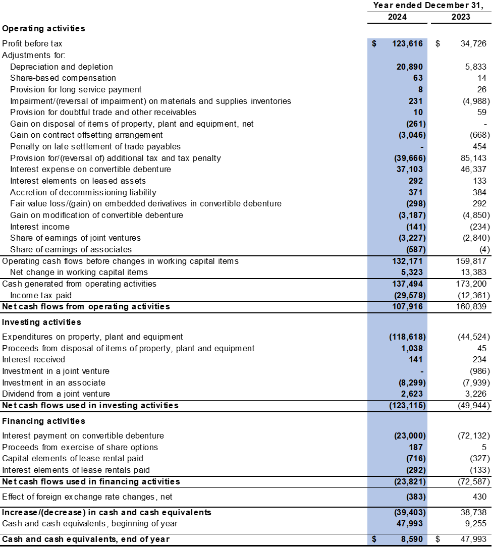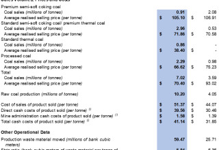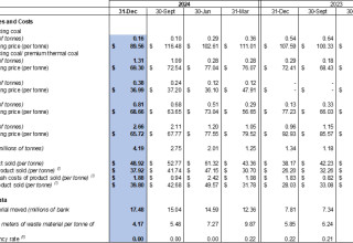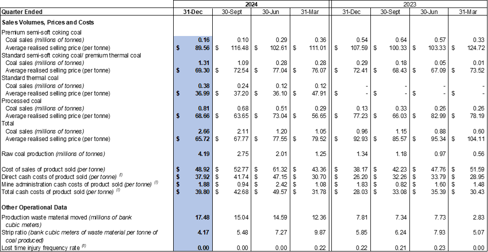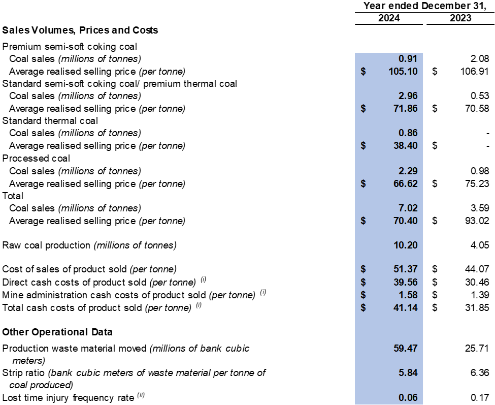 The Company recorded an average realised selling price of $70.4 per tonne for 2024 compared to $93.0 per tonne for 2023. The decrease was mainly due to the Company facing headwinds in the China coal market in 2024, leading to the Company changing its product mix to sell a greater percentage of lower-priced coal products. The product mix for 2024 consisted of approximately 13% of premium semi-soft coking coal, 42% of standard semi-soft coking coal/premium thermal coal, 12% of standard thermal coal and 33% of processed coal compared to approximately 58% of premium semi-soft coking coal, 15% of standard semi-soft coking coal/premium thermal coal and 27% of processed coal in 2023.