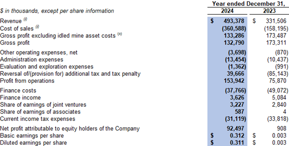The Company recorded a $153.9 million profit from operations in 2024 compared to $75.9 million profit from operations in 2023. The increase was mainly due to an increase of 3.4 million tonnes of sales volume in 2024 as compared to 2023 and a reversal of additional tax and tax penalty of $48.5 million was recorded in the fourth quarter of 2024.