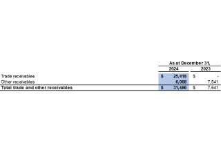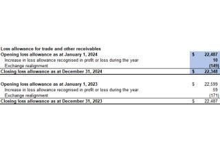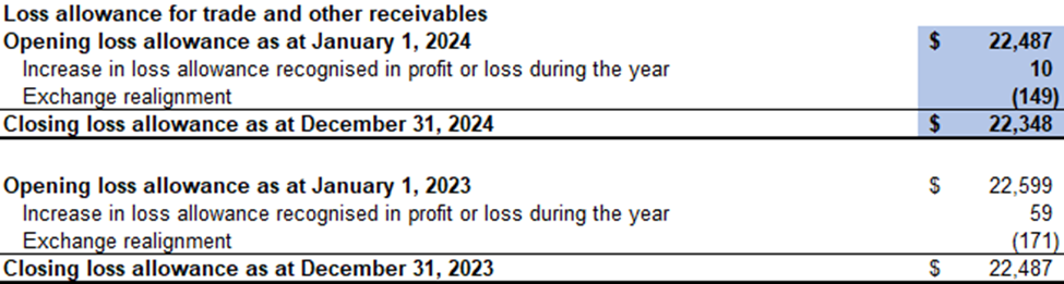 The Company has determined that the loss allowance on its trade and other receivables was $22,348 (December 31, 2023: $22,487) as at December 31, 2024, based upon an expected loss rate of 10% for trade and other receivables 90 days past due and 100% for trade and other receivables 180 days past due.