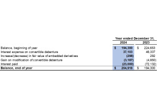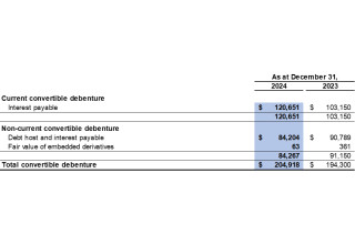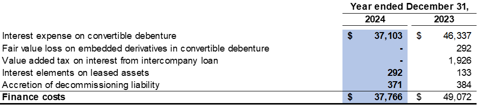 For the year ended December 31, 2024, the Company recorded interest expense of $37,103 related to the convertible debenture as a finance cost (2023: $46,337). The interest expense consists of the interest at the contract rate and the accretion of the debt host component of the convertible debenture. To calculate the accretion expense, the Company uses the contract life of 30 years and an effective interest rate of 14.1%.