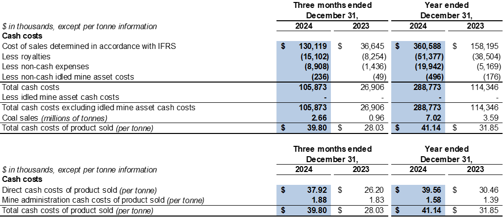 The Company's unit cost of sales of product sold increased from $38.2 per tonne in the fourth quarter of 2023 to $48.9 per tonne in the fourth quarter of 2024. The increase was mainly due to the Company expanding into certain categories of processed coal with higher production costs.