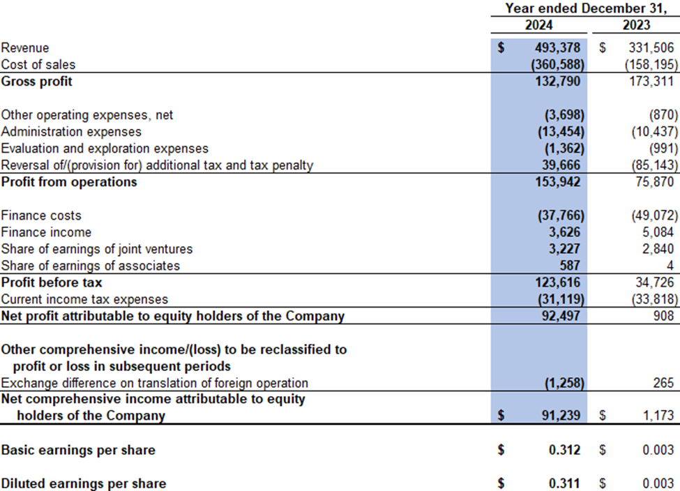 Revenue was $493.4 million in 2024 compared to $331.5 million in 2023. The financial results were impacted by increased sales volume, as a result of expansion of its sales network, diversification of its customer baseand expansion of the categories of coal products in its portfolio.