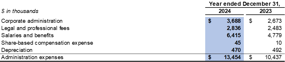 Administration expenses were $13.5 million in 2024 as compared to $10.4 million in 2023. The change was mainly due to higher daily administration fees and increased salaries and benefits as a result of expansion of operations.