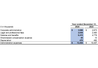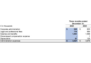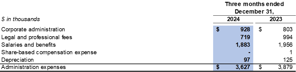 Administration expenses were $3.6 million in the fourth quarter of 2024 compared to $3.9 million in the fourth quarter of 2023.