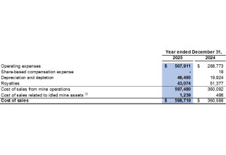 Cost of sales consists of operating expenses, share-based compensation expense, equipment depreciation, depletion of mineral properties, royalties and idled mine asset costs. Operating expenses in cost of sales reflect the total cash costs of product sold (a Non-IFRS financial measure, refer to "Non-IFRS Financial Measures" section of this press release for further analysis) during the year.