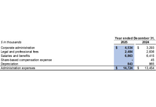 Administration expenses were $14.7 million in 2025 as compared to $13.5 million in 2024. The change was mainly due to higher daily administration fees and increased salaries and benefits as a result of an expansion of operations.
