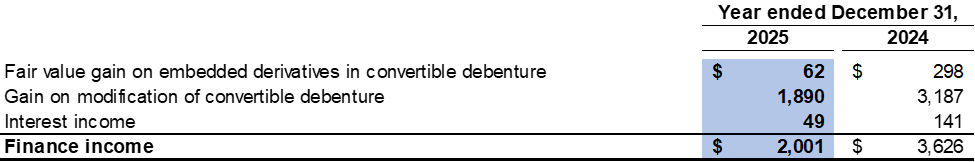 Finance costs were $10.5 million in the fourth quarter of 2025 compared to $6.9 million in the fourth quarter of 2024, which primarily consisted of interest expense on the $250.0 million Convertible Debenture.