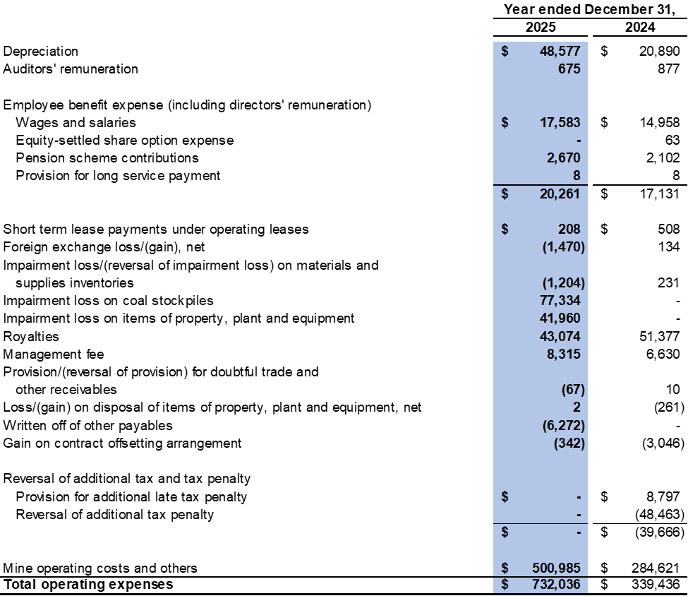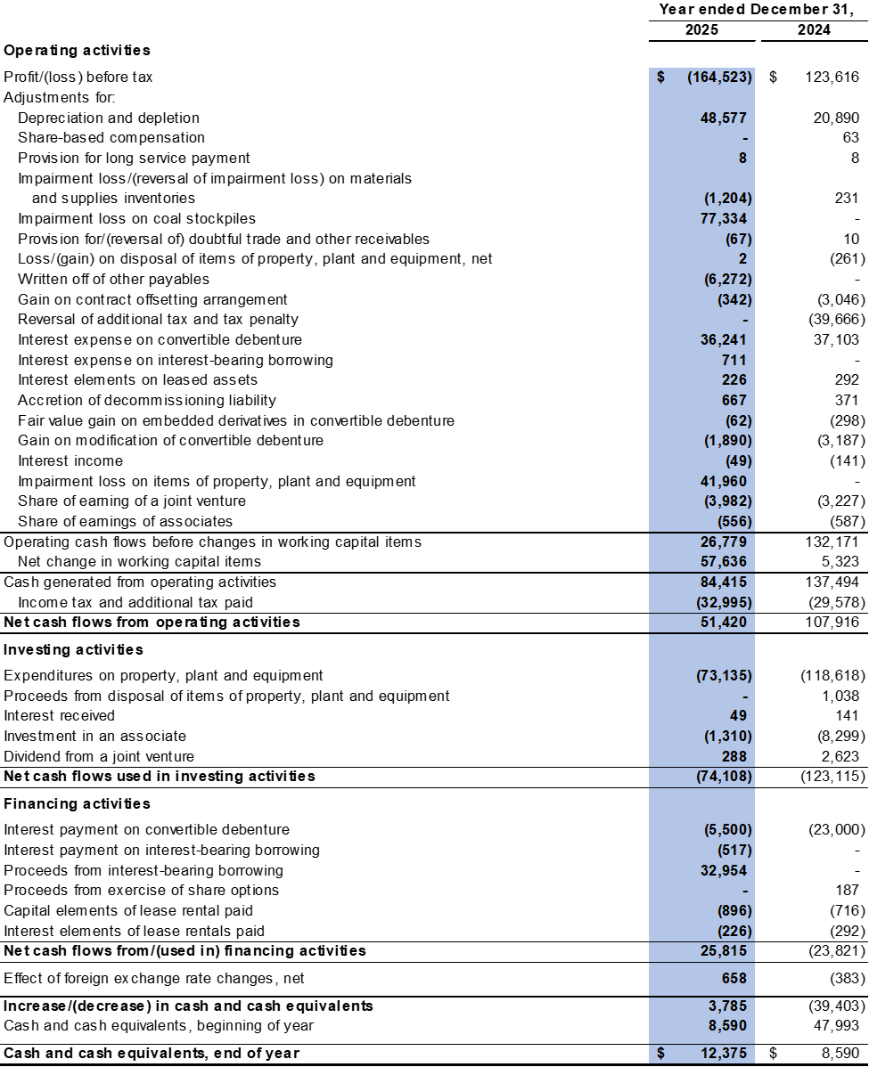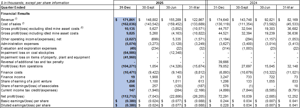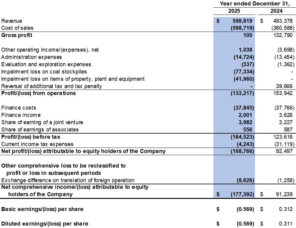 The Company recorded a $104.3 million loss from operations in the fourth quarter of 2025 compared to a $79.1 million profit from operations in the fourth quarter of 2024. The decrease was mainly due to the decreased average realised selling price realised in the fourth quarter of 2025 as compared to the same period in 2024, change in product mix, as the Company sold more processed coal with higher production costs and impairment losses on coal stockpile and items of property, plant and equipment of $65.0 million and $42.0 million were recorded respectively in the fourth quarter of 2025.
