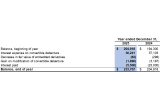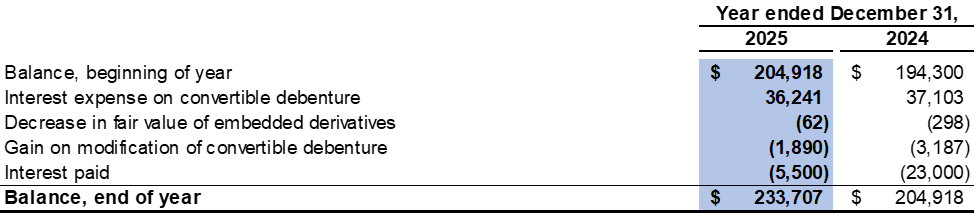 For the year ended December 31, 2025, the Company recorded interest expense of $36,241 related to the convertible debenture as a finance cost (2024: $37,103). The interest expense consists of the interest at the contract rate and the accretion of the debt host component of the convertible debenture. To calculate the accretion expense, the Company uses the contract life of 30 years and an effective interest rate of 14.1%.