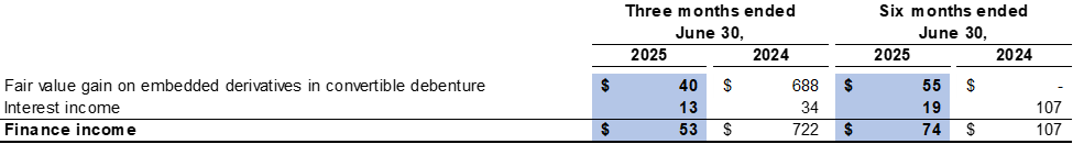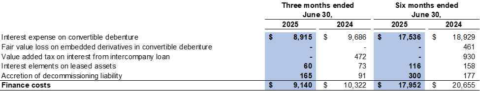 Finance costs were $9.1 million and $10.3 million for the second quarter of 2025 and 2024 respectively, which primarily consisted of interest expense on the $250.0 million Convertible Debenture.