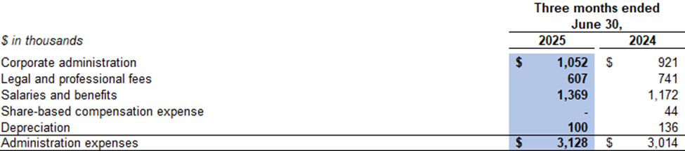 Administration expenses were $3.1 million for the second quarter of 2025 as compared to $3.0 million for the second quarter of 2024.