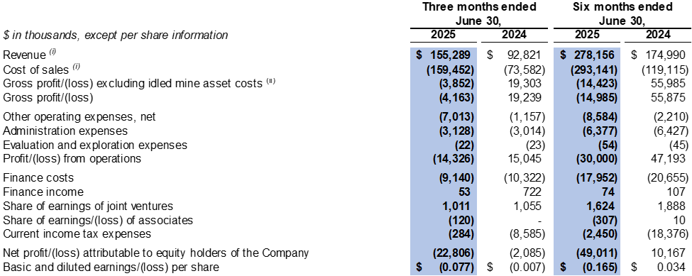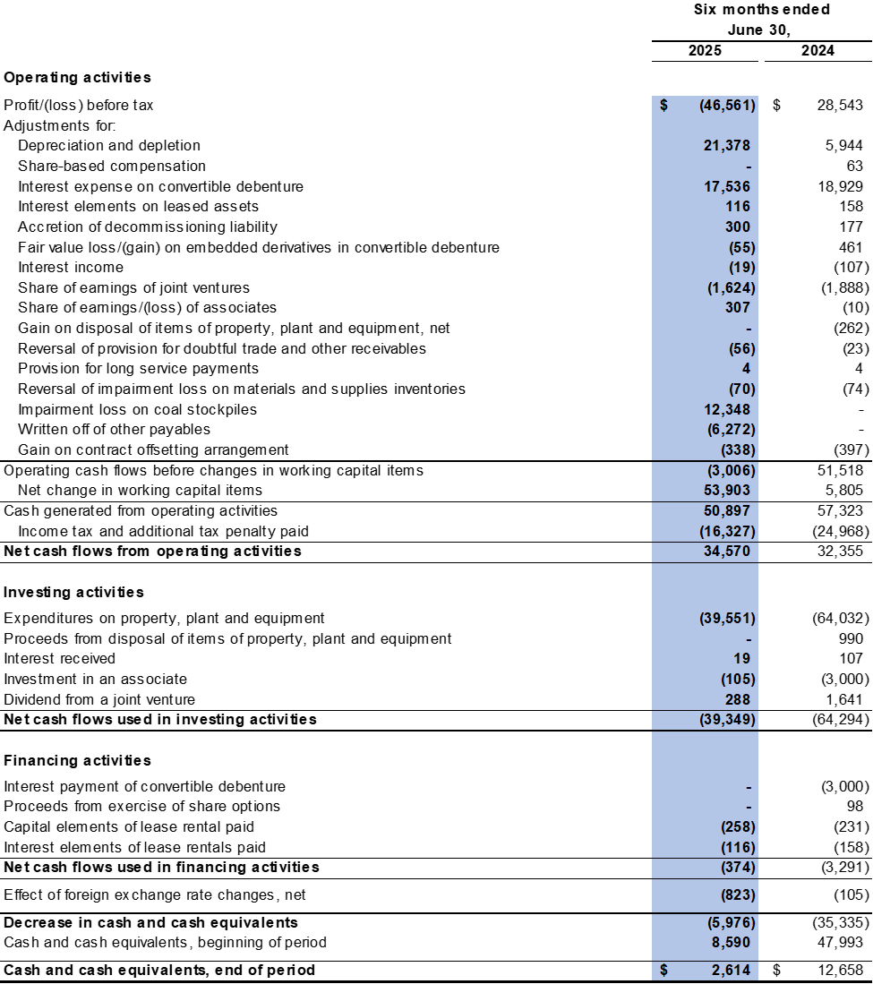Financial Results - The Company recorded a $14.3 million loss from operations for the second quarter of 2025 compared to $15.0 million profit from operation for the second quarter of 2024. The financial results were impacted by the decreased average realised selling price, the change in product mix, as the Company sold more processed coal with higher production costs, and an impairment loss on coal stockpiles of $12.3 million was recorded during the second quarter of 2025.