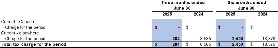 The Canadian statutory tax rate was 27% (2024: 27%). The Company's tax expense is as follows: