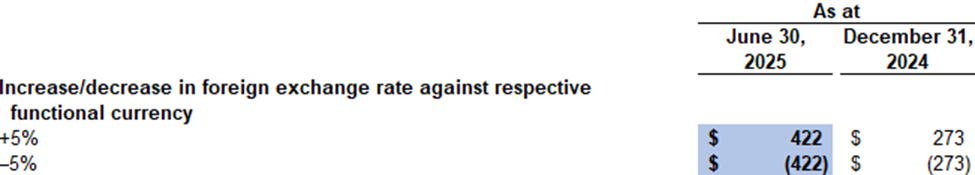 The sensitivity of the Company's profit/(loss) before tax due to changes in the carrying values of assets and liabilities denominated in foreign currencies is as follows. A positive number indicates an increase in profit before tax or a decrease in loss before tax, whereas a negative number indicates an increase in loss before tax or a decrease in profit before tax.
