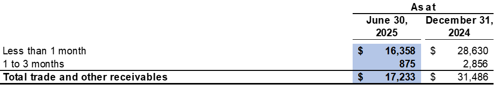 The Company has determined that the loss allowance on its trade and other receivables was $21,876 as at June 30, 2025 (December 31, 2024: $22,348), based upon an expected loss rate of 10% for trade and other receivables 90 days past due and 100% for trade and other receivables 180 days past due.