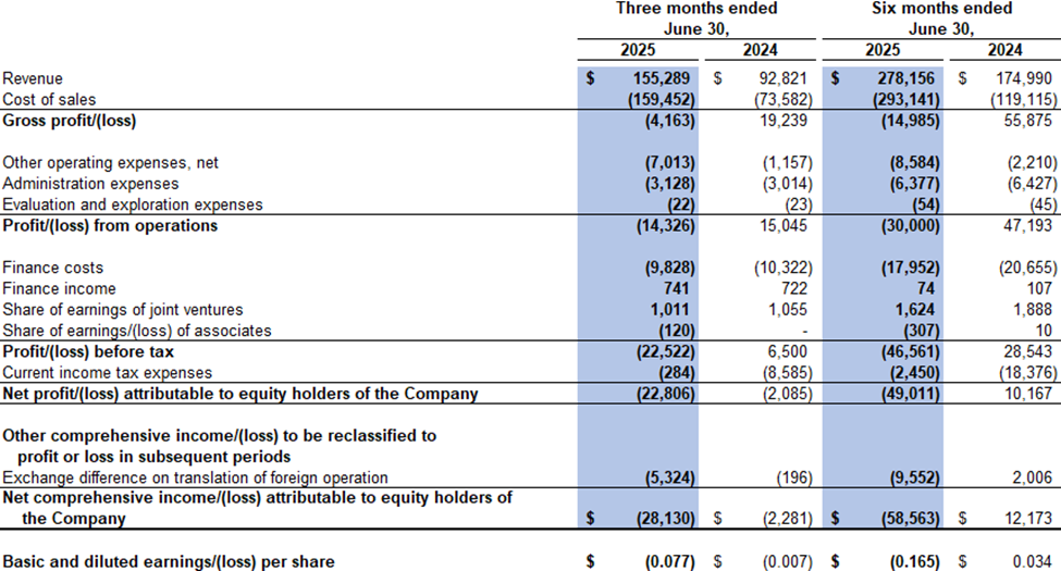 The Company recorded a $14.3 million loss from operations for the second quarter of 2025 compared to $15.0 million profit from operations for the second quarter of 2024. The decrease was mainly due to the decreased average realised selling price, the change in product mix as the Company sold more processed coal with higher production costs, and an impairment loss on coal stockpiles of $12.3 million was recorded during the second quarter of 2025.