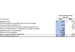 Other operating expenses were $7.0 million for the second quarter of 2025 (second quarter of 2024: $1.2 million). The increase was due to increased management fee and an impairment loss on coal stockpiles of $12.3 million was made for the second quarter of 2025, which was offset by a written off of other payables of $6.3 million.