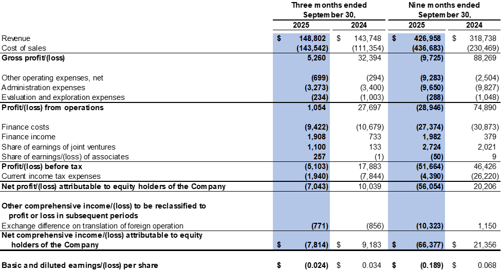 The Company recorded a $1.1 million profit from operations for the third quarter of 2025 compared to $27.7 million profit from operations for the third quarter of 2024. The decrease was mainly due to the decreased average realised selling price and the change in product mix as the Company sold more processed coal with higher production costs.