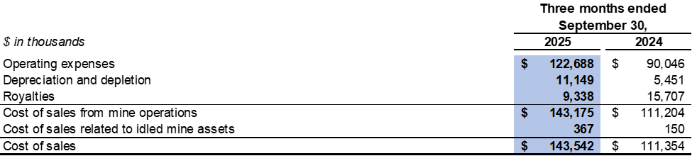 Cost of sales related to idled mine assets for the third quarter of 2025 included $0.4 million related to depreciation expenses for idled equipment (third quarter of 2024: $0.2 million).