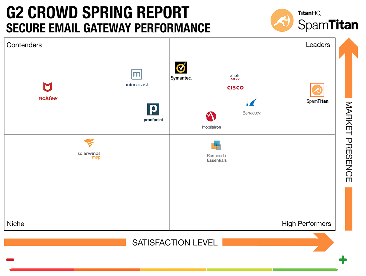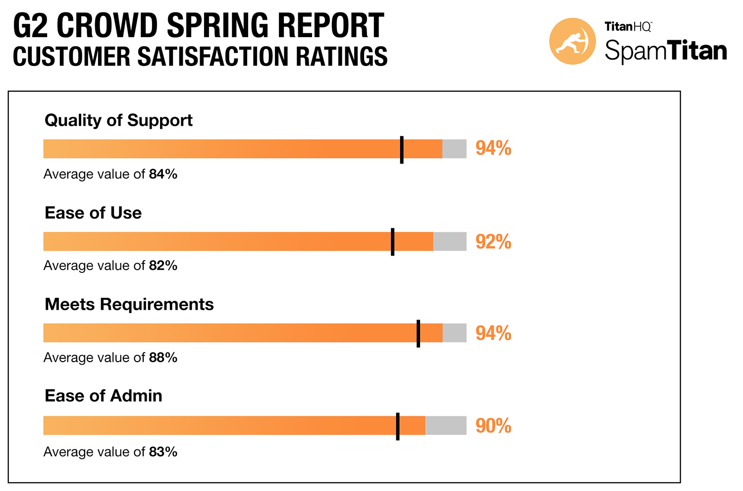 By being named a leader in this highly competitive category, SpamTitan continues to distinguish itself with the highest rating for customer satisfaction. In the Spring email security report SpamTitan consistently rated above average on all key metrics including Quality of Support, Ease of Use, Meets Requirements and ease of administration.