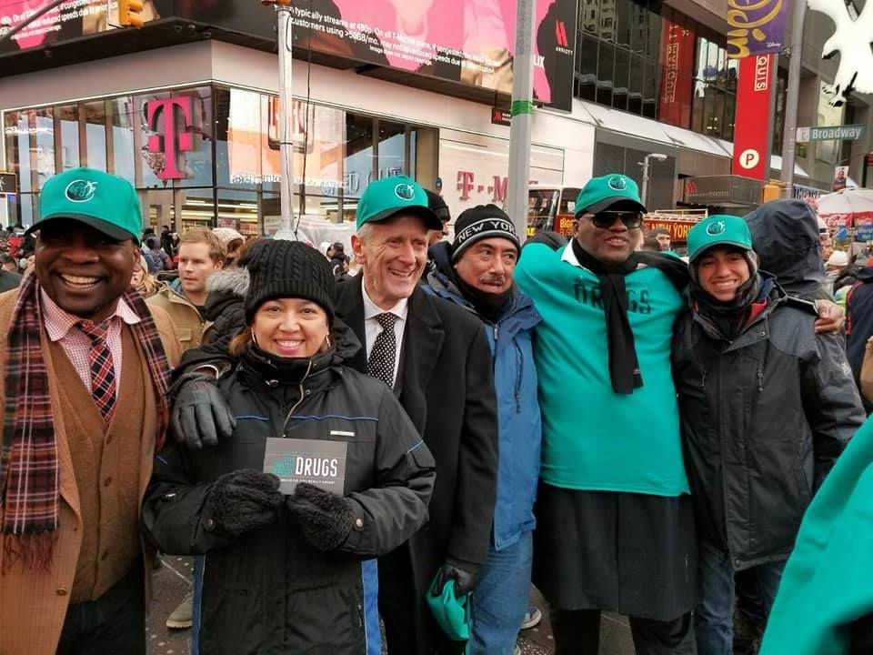Volunteers from the Church of Scientology New York and the Church of Scientology Harlem in their turquoise Drug-Free World caps and T-shirts (worn on top of overcoats) braved frigid temperatures to talk to tourists and residents and hand out copies of Truth About Drugs booklets. People approached the volunteers to tell them their own stories — tragically there were so many of them. A family from Australia — the parents are former addicts — stopped by to help. Singers, in town from the Caribbean island of St. Vincent, staged a spontaneous concert, drawing people to find out more.