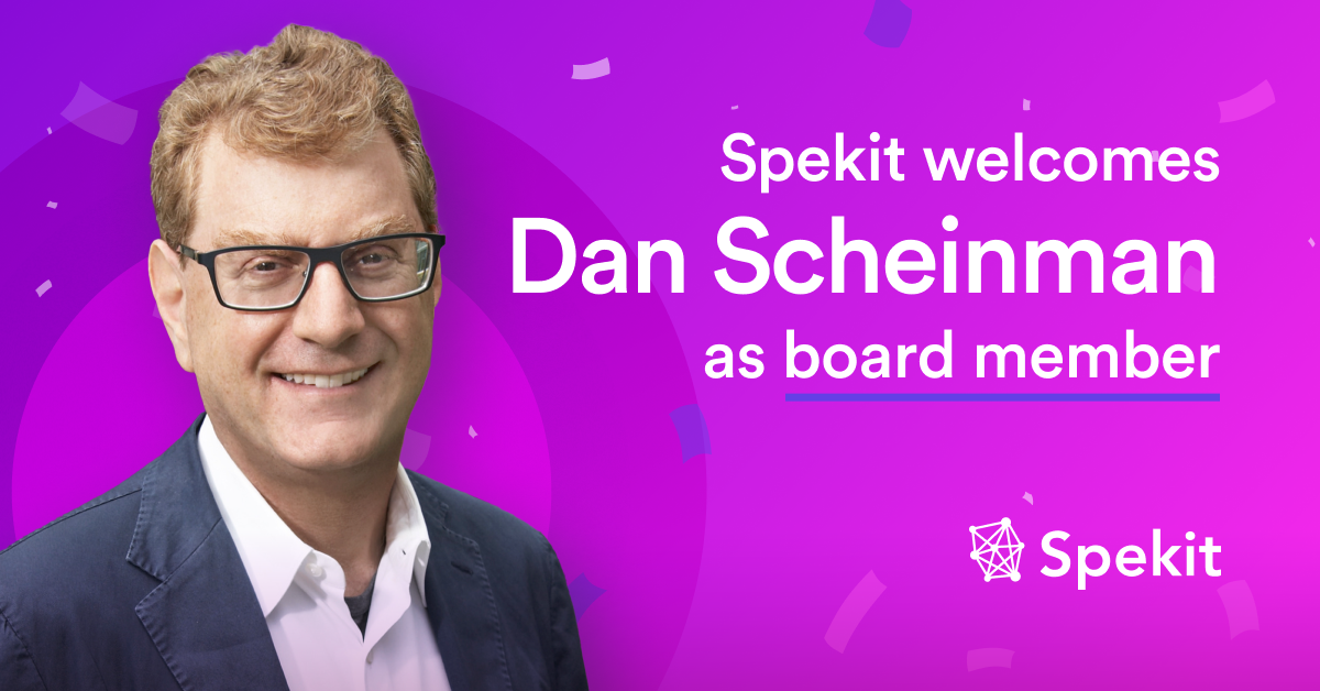 "We're thrilled to welcome Dan Scheinman to the Spekit board," said Spekit CEO and Co-founder, Melanie Fellay. "He's had a front-row seat and played an integral role in the development of transformational technologies as they've launched, evolved and pulled our workplaces forward. At Spekit, we believe that the way we onboard, train and drive change within organizations is long overdue for disruption. I can't think of anyone better suited to help bring our vision to life and the future of learning at work to the masses."