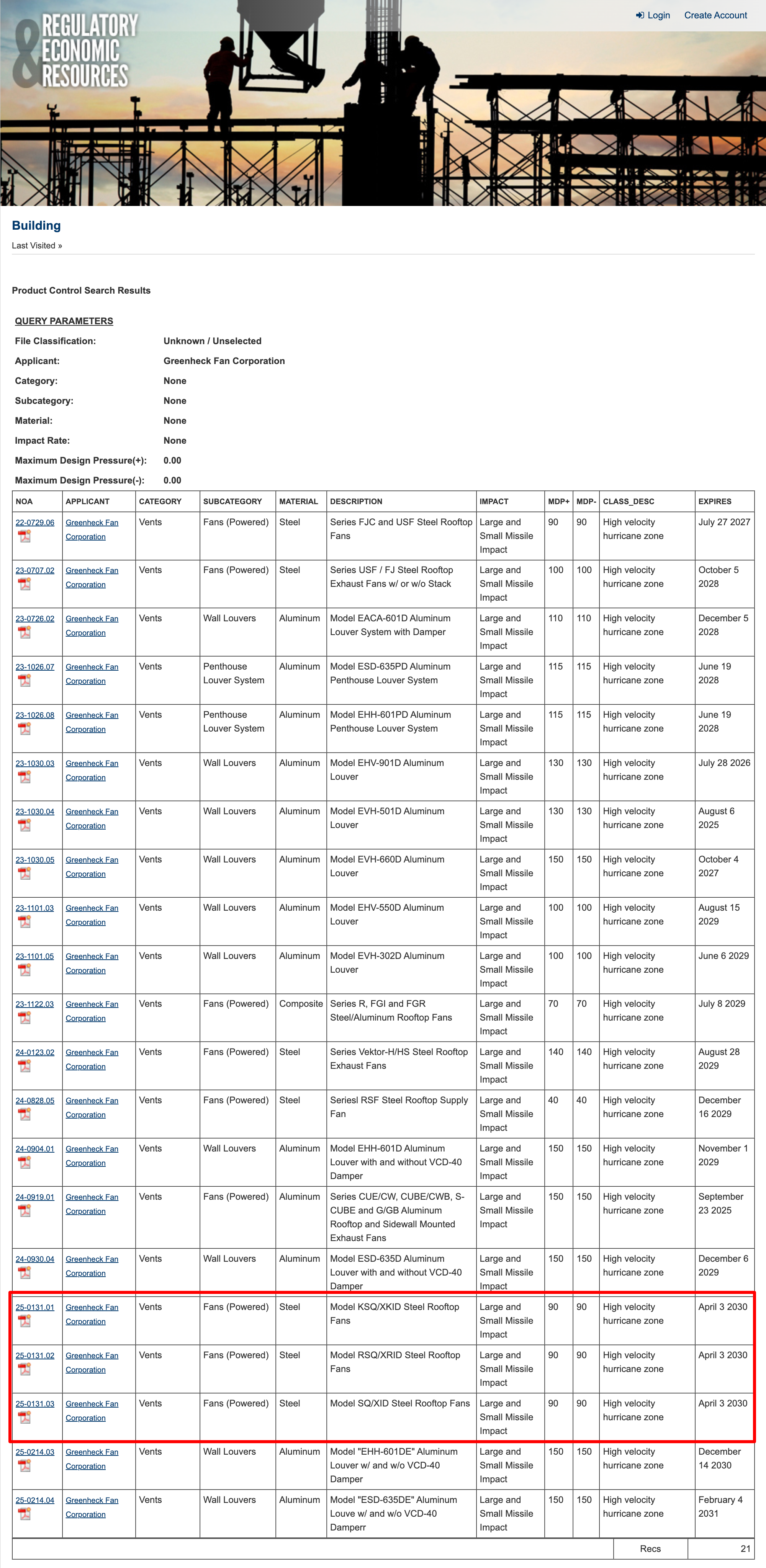 TAMPA, Fla., May 12, 2025 (Newswire.com) - Stan Weaver & Company is proud to announce a significant product update from our valued manufacturer partner, Greenheck. The KSQ, RSQ, and SQ Outdoor mixed flow wheel products have officially received Miami-Dade Notice of Acceptance (NOA) and Florida Product Approval (FPA), confirming their performance in high-wind conditions and expanding their use in hurricane-prone regions.