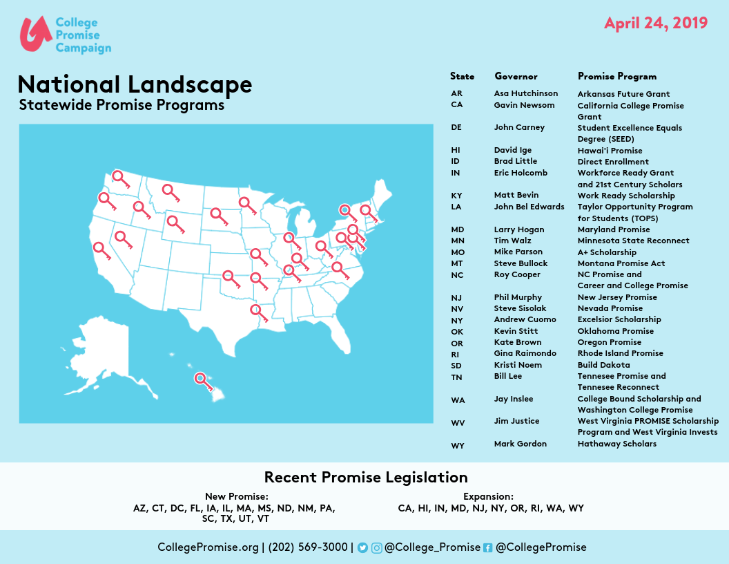 WASHINGTON, April 24, 2019 (Newswire.com) - The College Promise Campaign, a nonprofit working to increase the number of quality College Promise programs, released a statewide program landscape during the Michigan College Promise Symposium at the Detroit Regional Chamber. In the fall of 2018, the campaign announced over 300 active College Promise programs across 44 states. Today, they released a status update on statewide programs engaged in the free college movement. The release highlights 24 states that have actively passed and taken steps to implement a statewide “Promise” program. These statewide programs reflect the bipartisan nature of a movement intended to both bolster the American talent pipeline and increase student success outcomes. “All across the nation, momentum has been building throughout states and localities to create opportunities which allow students to start and complete a college education without taking on mountains of student debt,” said Martha Kanter, Executive Director of the College Promise Campaign.