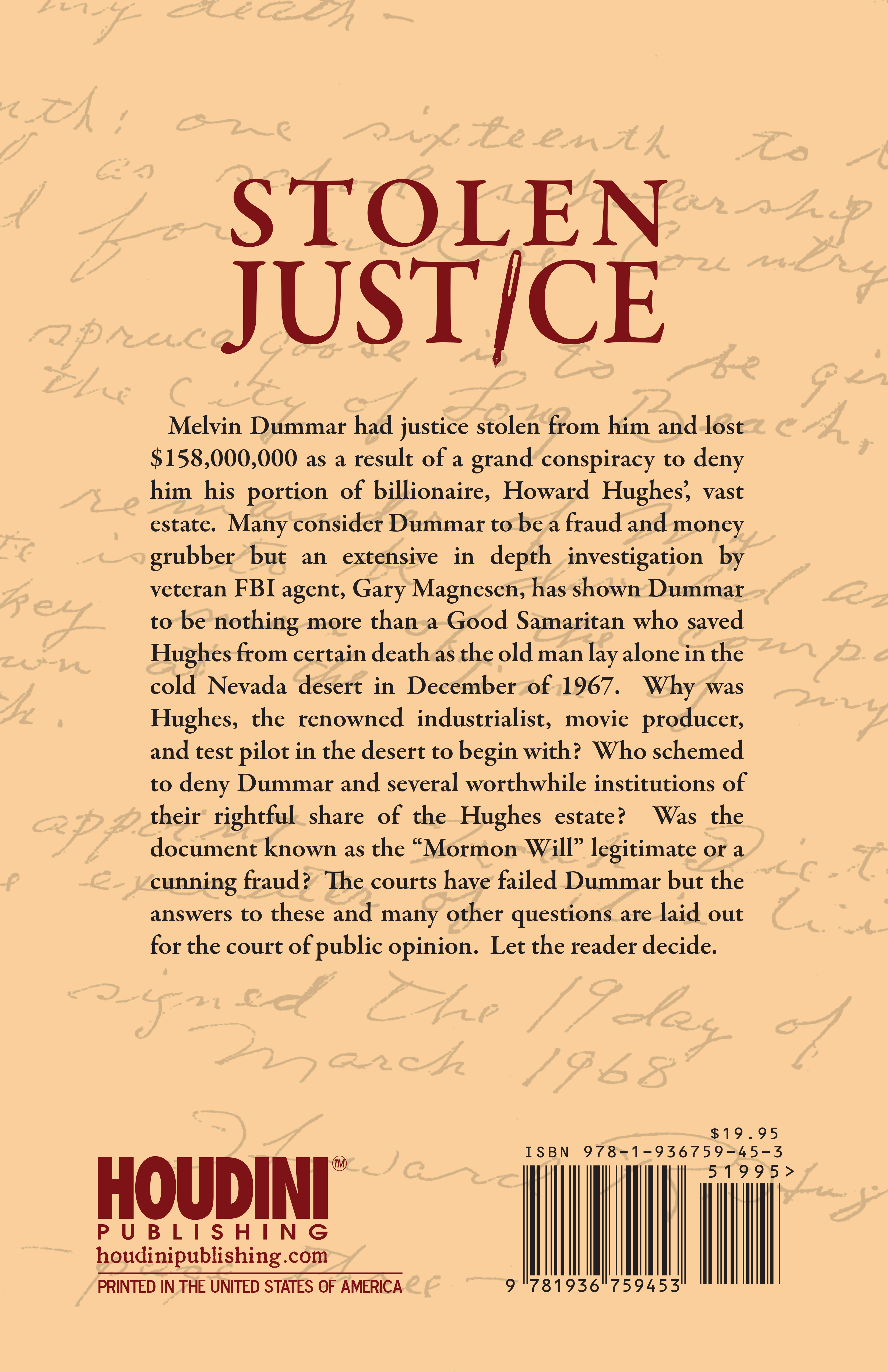 Now, 38 years later, Gary Magnesen, a highly decorated retired FBI agent has resurrected the investigation and pried open the dusty old case. He found a cesspool of treachery that rivals any work of fiction, including perjury, obstruction of justice, possible collusion by law enforcement officials, burglary, and even a murder. He also exposes the key figure in the conspiracy to thwart justice. In his newly released book, STOLEN JUSTICE – The True Story Behind the Howard Hughes Will, Magnesen lays out the case for the legitimacy of the Mormon Will by presenting previously unexplored evidence and citing numerous heretofore unknown witnesses who move the case well beyond the legal goalposts.