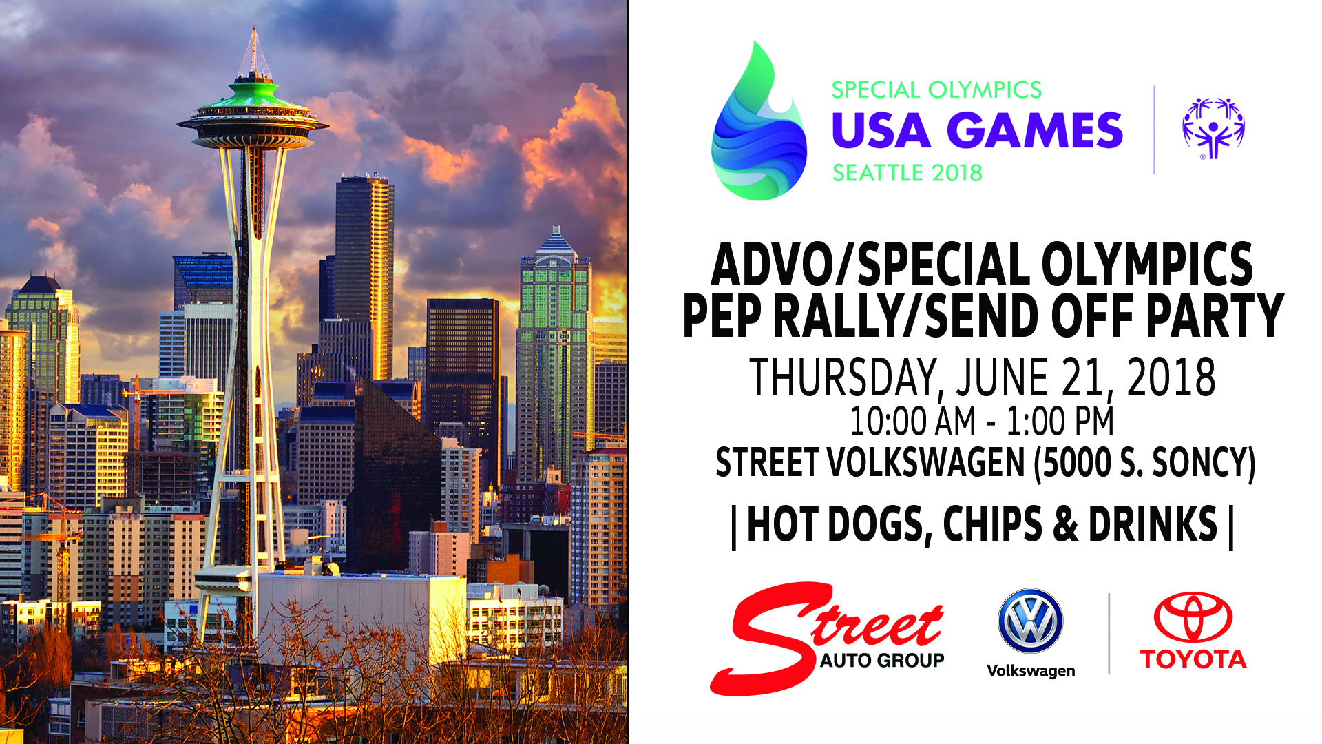 Amarillo, Texas, June 13, 2018 (Newswire.com) - Street Automotive Group will host ADVO and the Special Olympics athletes who are headed to Seattle for the Special Olympics USA Games. The company will hold a special pep rally and send off party in honor of the athletes on Thursday, June 21, 2018 at Street Volkswagen of Amarillo.