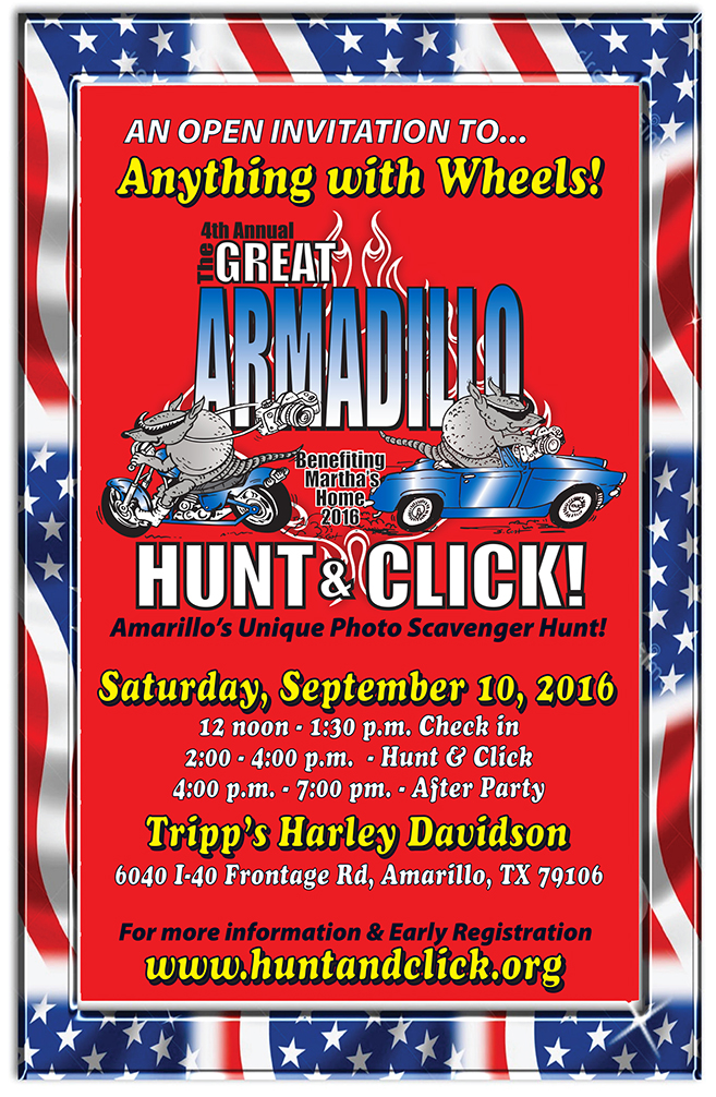 The Hunt & Click is a scavenger hunt group activity where participants travel to various locations around Amarillo and take a photo at each stop. The goal for participants is to visit as many locations as possible over a two-hour period. Each photo is worth points and whoever gathers the highest score will be crowned as the Grand Champion in both a motorcycle and automobile category.