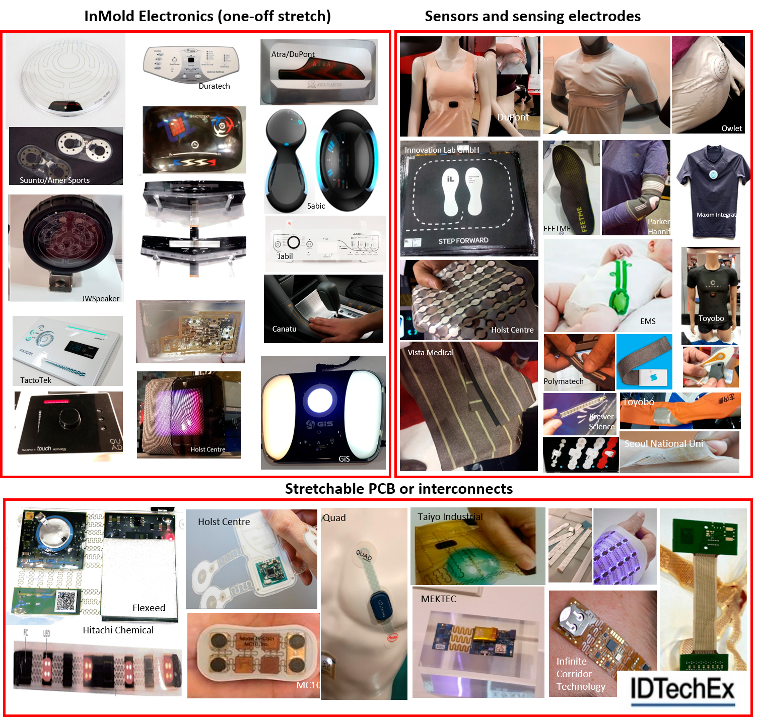 The images below suggest that the nearly-commercialized or commercialized cases are varied. For example, InMold Electronics products are beginning to enter the market again. These products rely on the ability of functional materials to undergo a major one-off stretching event. Various fitness products utilizing stretchable conductors as electrodes monitoring the heartrate or as respiratory sensors are already on the market and selling. Similar products are being applied to monitor pregnancy or to monitor the vital signs of animals. Many are also working on stretchable interconnects or printed circuit boards. Here too, a number of products are already on the market.