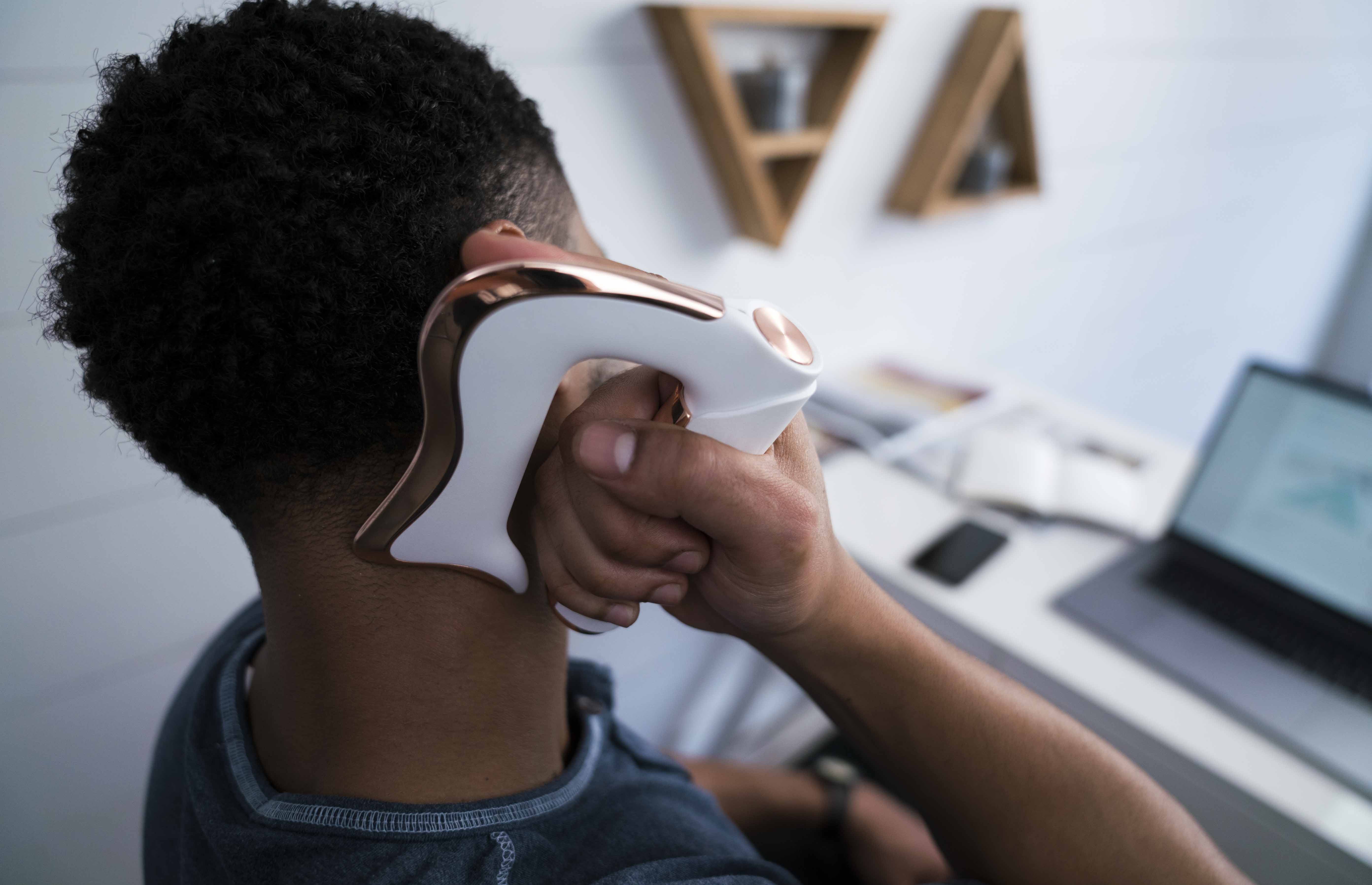 Strig is easy to use. Press the power button to turn on, apply the Strig hypoallergenic cream onto the skin, begin massaging using a glide-action motion for 150 seconds, then press and hold the power button to turn it off.
