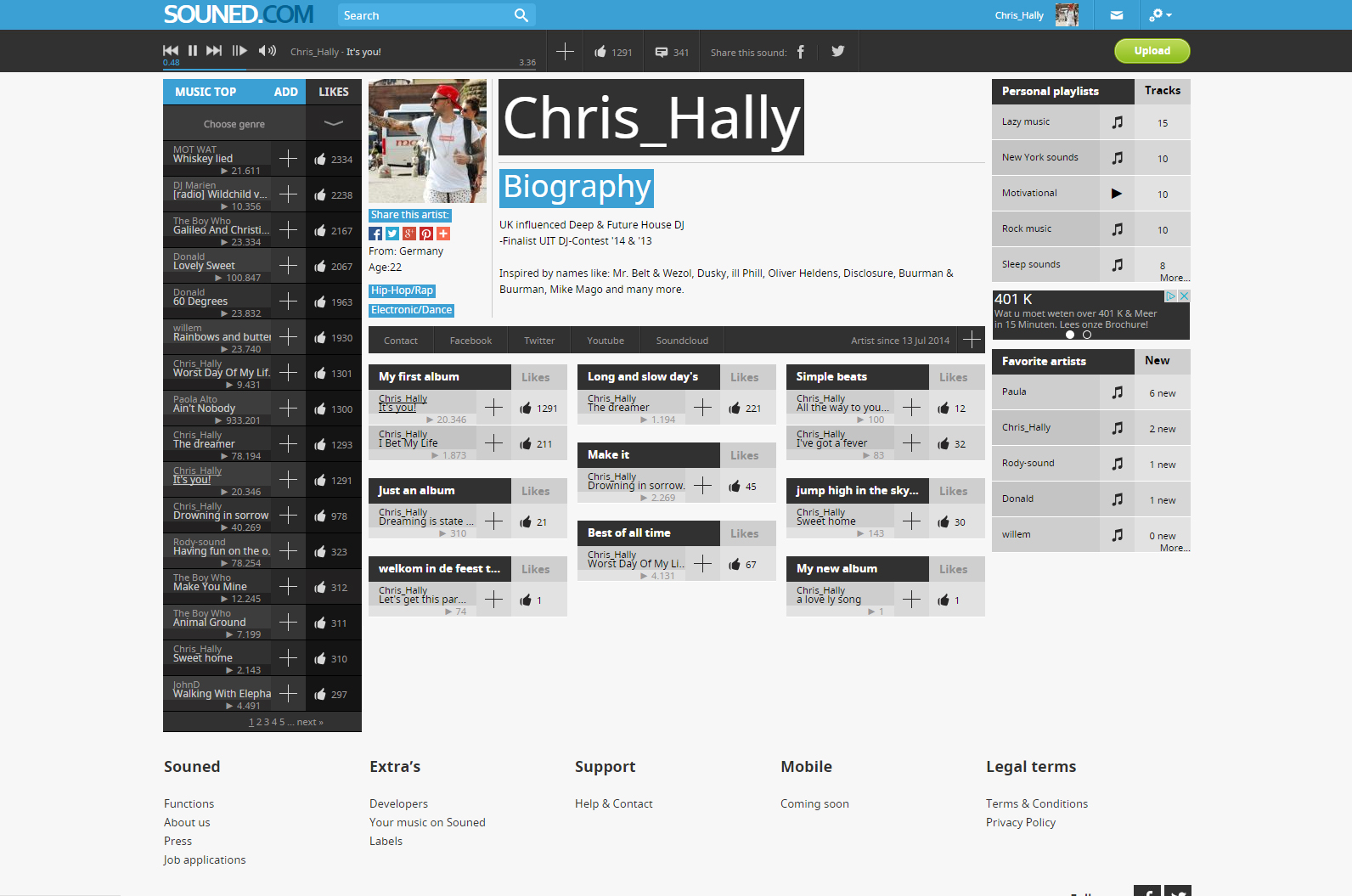 All sounds that are uploaded in the selected area on the map will appear in the music top. Users of Souned will range the sounds in the music top through liking the sounds. More likes means being higher in the music top. When you zoom into your own neighborhood you can see which artists and bands are living near you and which sounds are most popular. When you zoom out further there are more possibilities. You can select a whole country, or part of it on your map and then the music top will show the most popular sounds of that country.