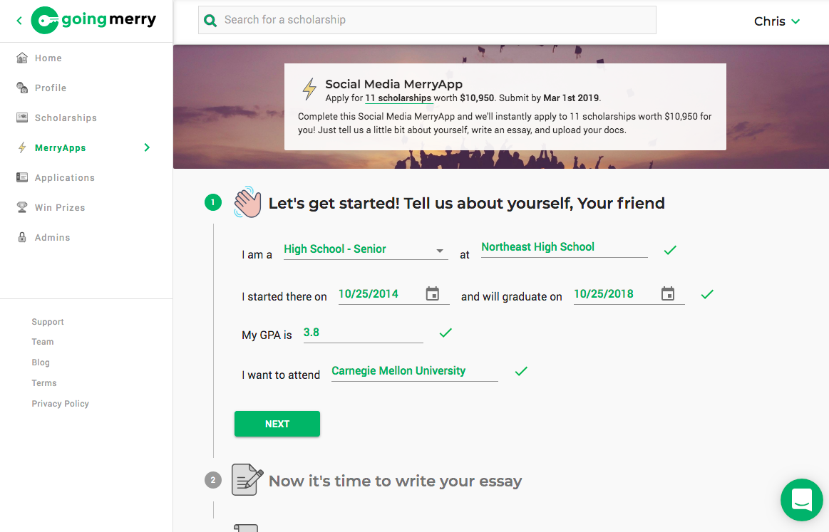 In addition to MerryApps, Going Merry hosts thousands of individual scholarships for students of all backgrounds. Every student that joins is matched with hundreds of thousands of dollars in available scholarships, and a unique algorithm helps students to apply for the scholarships they have the best chance of winning.