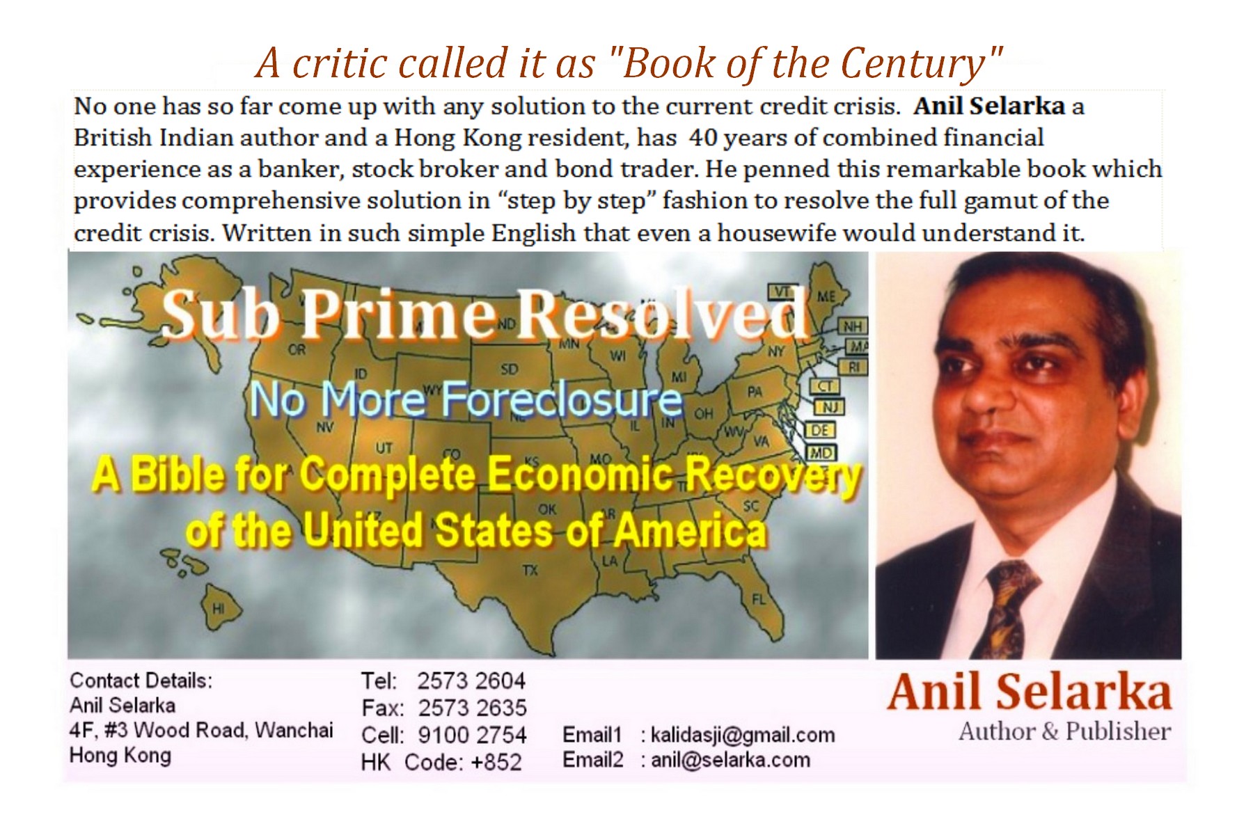 Sub Prime Resolved - a New Book by Anil Selarka - British Author from Hong Kong offers total solution to financial crisis.
